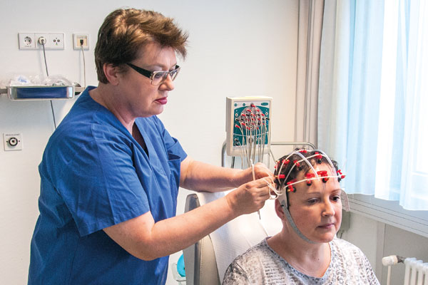 Im EEG-Labor (EEG = Elektroenzephalografie) messen wir die Hirnströme eines Patienten und zeichnen sie digital auf. Neben Standardableitungen finden auch 24-Stunden-Langzeituntersuchungen statt. Auf den Intensivstationen gibt es ein mobiles EEG-Gerät. Das EEG-Labor arbeitet eng mit den Inneren Kliniken des Marienhospitals zusammen. So wird etwa das Schlaflabor gemeinsam genutzt, um Patienten mit verschiedenen schlafgebundenen neurologischen Störungen zu untersuchen. Dazu zählen u. a. nächtliche epileptische Anfälle, das Schlafapnoe-Syndrom oder Schlaflosigkeit (Insomnie).
