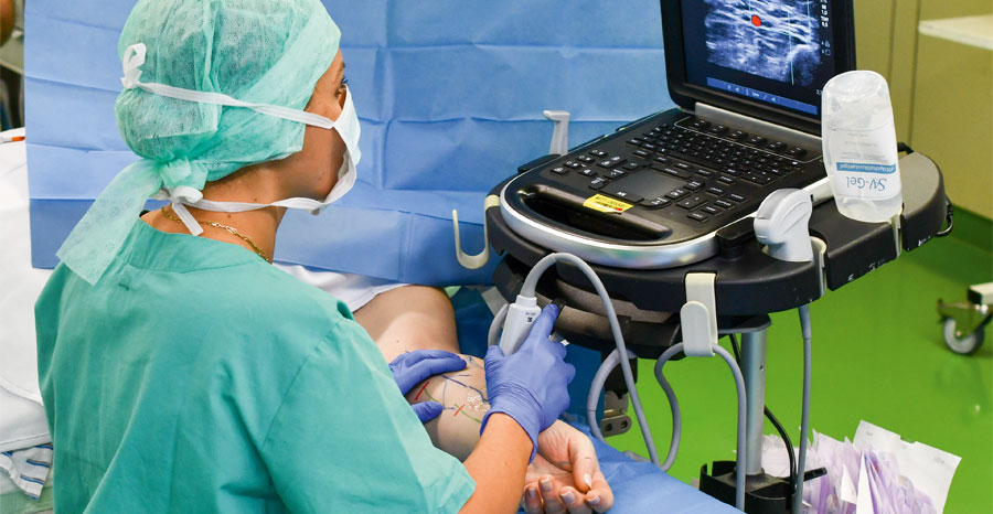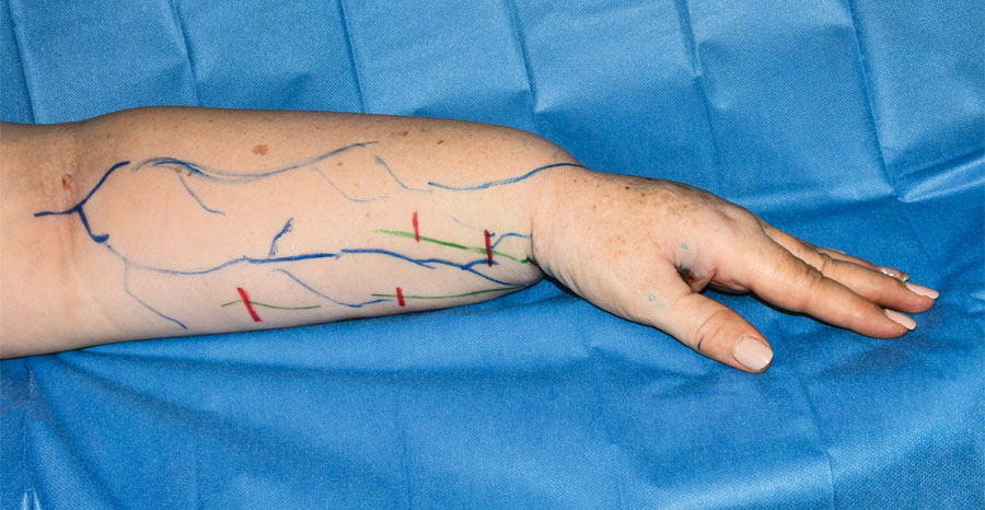 „Vor dem operativen Eingriff zeichnen wir auf der Haut des Patienten die Stelle ein, bis zu der wir das noch intakte Lymphgefäß bzw. den Lymphfluss nachverfolgen können. Hier setzen wir einen kleinen Schnitt. Dann wird der Bypass gelegt, das heißt, das Lymphgefäß wird direkt mit der Vene verbunden. Sie ist damit in der Lage, Lymphe zu entsorgen und über die Nieren auszuscheiden,“ erklärt der Chirurg.