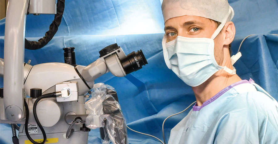 Um mithilfe des Mikroskops die weniger als 0,3 mm feinen Bypässe zu legen, bedarf es nicht nur extrem feiner Instrumente, sondern auch ultrafeiner Fäden – solche, die man mit bloßem Auge gar nicht sieht. Dr. Weitgasser erläutert: „Für den Patienten ist es kein großer Eingriff mit sehr wenig Risiko. Er kann sogar nur unter lokaler Betäubung durchgeführt werden. Im besten Fall erleben wir schon während der Operation, dass das Gewebe weicher wird und der Überdruck sich abbaut.“