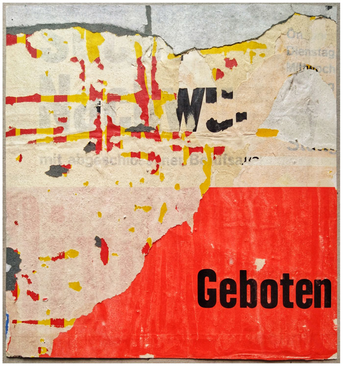Die Werke bestehen aus echten Plakatierflächen, die Bodmer aus dem öffentlichen Raum Stuttgarts geborgen hat. Über Jahre hinweg überklebt, verwittert, manchmal bemalt – genau diese Spuren nimmt der Künstler zum Ausgangspunkt seiner Arbeit. In aufwendigen Bearbeitungsprozessen legt er einzelne Schichten frei, reißt an, kratzt ab, kombiniert Fragmente. Entstanden sind vielschichtige Bilder, die vom städtischen Leben erzählen – mitunter poetisch, mitunter politisch, immer überraschend.
