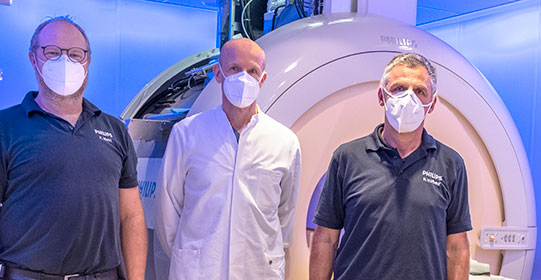 Beide MRT-Geräte werden seit Dezember 2020 schrittweise von Philips-Technikern auf den neuesten Stand gebracht. Die großen Permanentmagnete in den Geräten bleiben. Rechner, Teile der Geräte und Software werden aktualisiert. „Dadurch verringert sich die Untersuchungszeit spürbar“, so Markus Zähringer. Für eine Aufnahme des Gehirns muss ein Patient nur noch 10 statt 17 Minuten in der Röhre des Geräts liegen. Zugleich erhöht sich der Detailreichtum der Aufnahmen, sodass jetzt noch kleinere Strukturen darstellbar sind.