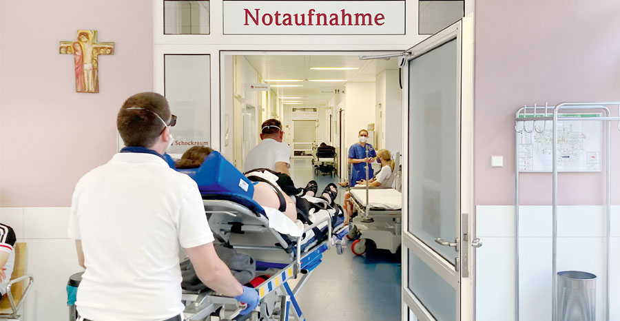 Das heißt, egal mit welchem Krankheitsbild die Patienten eingeliefert werden oder auch eigenständig als sogenannte Fußgänger in die Notaufnahme kommen: „Erstversorgung mit Diagnostik und Therapie finden bei uns statt. Danach ist selbstverständlich die Fachexpertise anderer Abteilungen von großer Bedeutung für die weitere Behandlung“, so der Ärztliche Direktor. Konkret: Ob Knochenbruch, Kreislaufprobleme oder auch wenn der Hubschrauber mit einem Verbrennungsopfer auf dem Dach landet – die Erstversorgung geschieht in der Klinik für Notfallmedizin.