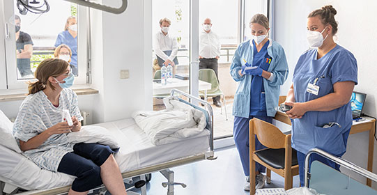 Was aber passiert, wenn dieses ausfällt – sei es aufgrund eines Defekts oder wegen eines Cyberangriffs? Können die Patienten dann trotzdem versorgt werden? Dies wollte die erste IT- (Informations-Technologie)-Notfallübung am 20. Juli 2021 herausfinden. Lorenz Kiefner lud dazu freiwillige Pflegekräfte und Ärzte ins Skills Lab (Kenntnis-Labor) des Hauses ein. Es besteht aus zwei Krankenzimmern und weiteren Räumen, die etwa als Dienstzimmer verwendet werden können. Das Skills Lab wird sonst vom Pflegebereich genutzt, um Handgriffe und Abläufe zu trainieren. Die Patientin wurde von einer Pflegekraft gespielt. Vom Balkon aus konnten fachkundige Beobachter etwa aus Bildungszentrum, Pflege und Verwaltung die Übung verfolgen.