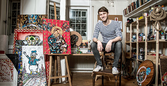 Er erläutert: „Konsumgüter waren in der Sowjetunion verpönt, und die Menschen mussten die Dinge des Alltags oft mehrmals verwenden. Aufgewachsen bin ich jedoch in Deutschland in einer Zeit des Überflusses und einer zunehmenden Kultur der Wegwerfgesellschaft.“ In seinen farblich meist intensiven und kraftvollen Werken finden sich daher Donald Duck oder die US-Flagge ebenso wie Matrjoschka-Puppen oder Wladimir Putin.