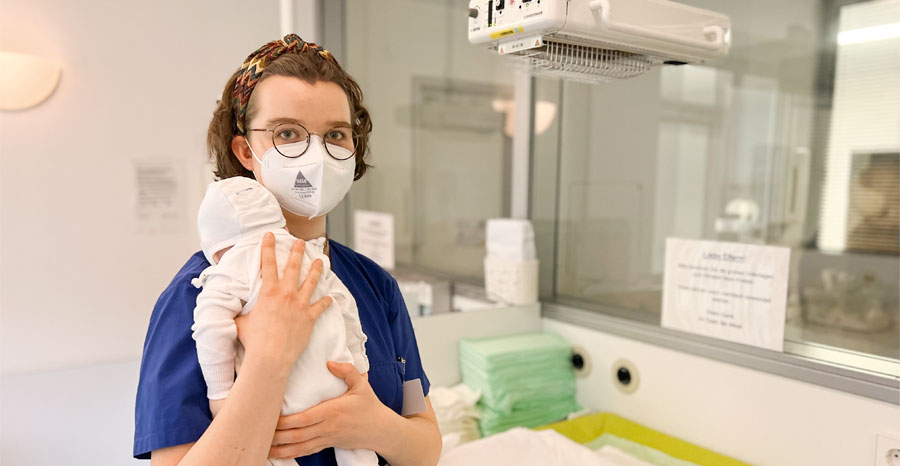 Leonie Höllger, die in ihrem zweiten Semester Hebammenwissenschaft studiert, absolviert ihre Praxiseinsätze auf der Mutter-Kind-Station und im Kreißsaal des Marienhospitals. Rund ein Drittel ihrer Studienzeit verbringen die Studierenden auf Geburtsstationen oder bei freiberuflichen Hebammen.