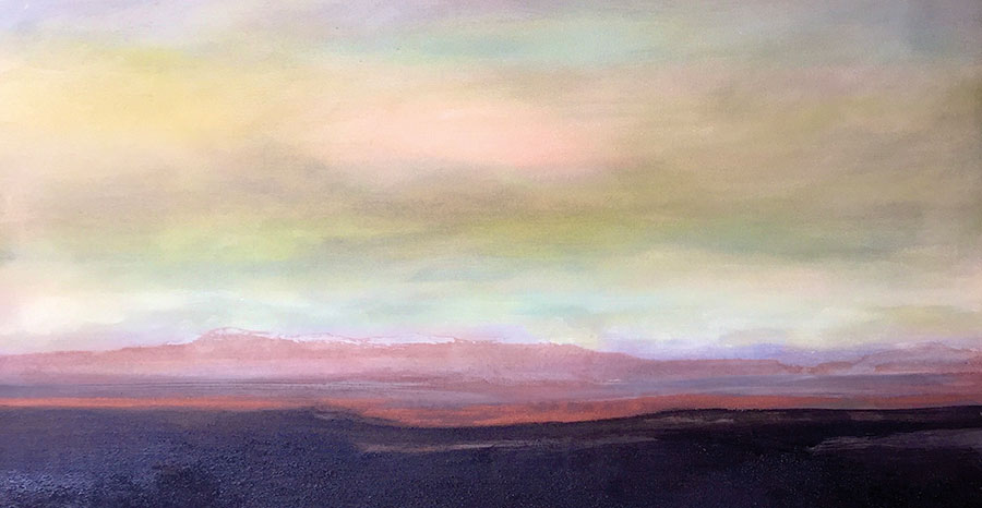 In ihren Bildern entfaltet Johanna Sandau Landschaften aus Farbschichten, die zwischen gegenständlicher Darstellung und offener malerischer Interpretation liegen. Meer, Berge und weite Himmelsräume sind zentrale Themen ihrer Werke. Die Künstlerin setzt dabei auf das Zusammenspiel von Farbe, Raum und Atmosphäre, um eine Stimmung zu erzeugen, die den Betrachter einlädt, den eigenen Blick immer wieder neu zu orientieren. Feine horizontale Linien gliedern die Bildflächen und schaffen ein Gefühl von Weite, das sowohl Raum für Vorstellung als auch für emotionale Wahrnehmung lässt.