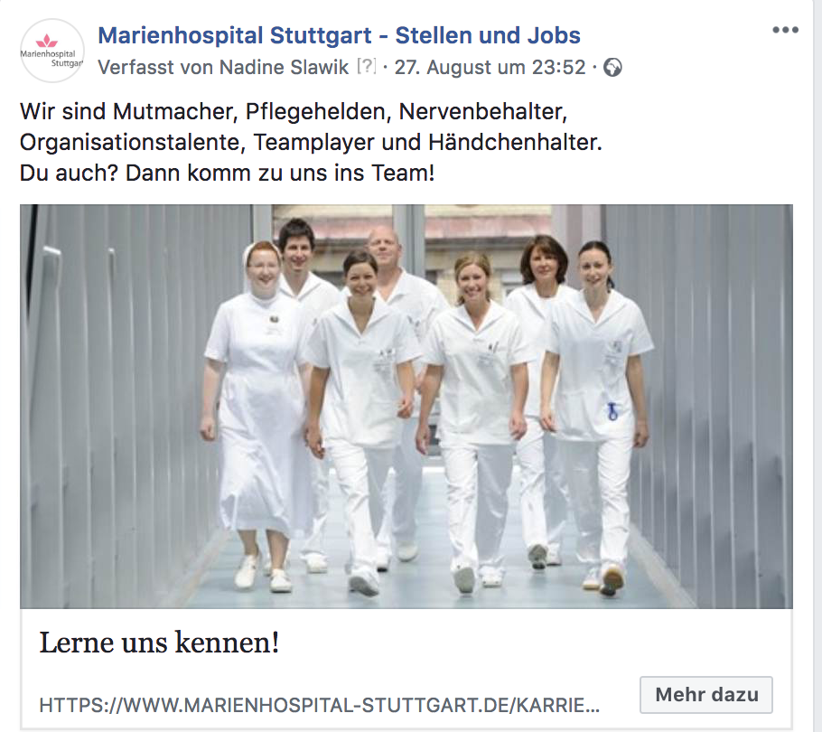 Ab sofort sind wir mit unserer Facebook-Seite „Marienhospital Stuttgart – Stellen und Jobs“ in Facebook zu finden. Sie suchen einen Job in der Pflege, im ärztlichen Bereich oder in der Verwaltung? Dann schauen Sie mal auf unserer Facebook-Seite vorbei! Sie finden dort auch unseren Ausbildungsfilm, interessante Infos übers Marienhospital und Mitarbeiter im Porträt, die von ihrem Arbeitsplatz im Marienhospital erzählen.