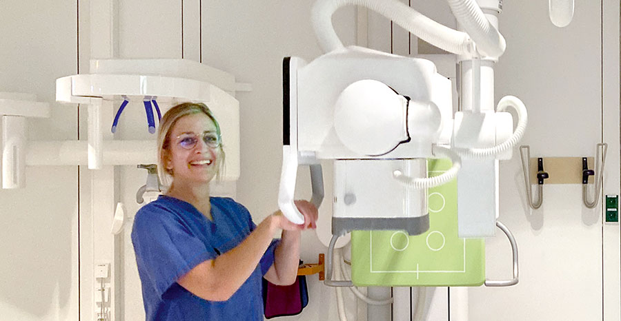 Zwei Fragen drängen sich da auf. Zum einen: Sind die Assistenten einer hohen Strahlung ausgesetzt? Anita Hahn kann das guten Gewissens verneinen. Bei vielen Untersuchungen sind die MTRAs geschützt hinter einer Scheibe, wo sie die Geräte vom Rechner aus steuern. Zudem gibt es Schutzkleidung. Und jeder Mitarbeitende hat eine Strahlenschutzplakette, die einmal im Monat ausgewertet wird. „In meinen 25 Jahren Berufsleben habe ich es noch nie erlebt, dass die Werte zu hoch waren“, sagt Anita Hahn.