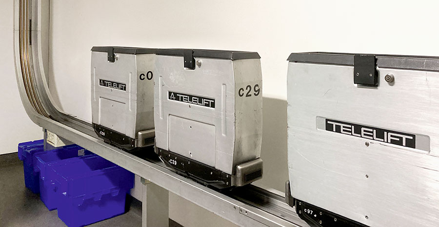 Dort wird die komplette Eingangs- und Ausgangspost bearbeitet. Dutzende von Postfächern für verschiedenste Abteilungen reihen sich aneinander. Und dann gibt es ja noch den Telelift, der einen Bahnhof gleich hinter der Poststelle hat. Von dort aus machen sich über ein Schienennetz an der Decke kleine Metallboxen mit zum Beispiel Lieferscheinen auf ihren Weg durchs ganze Haus.