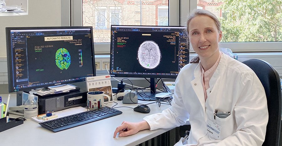 Deswegen gilt bei einem Schlaganfall nach wie vor: Jede Minute zählt. Auch wenn das Zeitfenster insgesamt bis zu 24 Stunden groß sein kann, je nach Schwere des Falls und der dafür erforderlichen Behandlung. „Die Information, wie lange eine bestimmte Symptomatik besteht, ist ganz wichtig für uns, damit wir wissen, welche Therapien wir machen können“, so Dr. Pagel. Schon bevor die Patienten in der Notaufnahme ankommen, steht das Team der Stroke-Unit bereit. Wenige Minuten nach Einlieferung wird eine Computertomografie gemacht, dann wird gegebenenfalls in Absprache mit der Neuroradiologie entschieden, wie es weitergeht. „Es gibt eine wirklich gute kollegiale Zusammenarbeit hier“, sagt Dr. Pagel, die seit Anfang 2019 im Marienhospital ist.