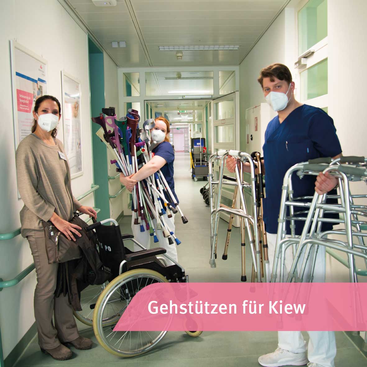 Die Spenden des Marienhospitals, wie zum Beispiel manche Gehstützen, mussten erst repariert werden. Die Handwerker des Marienhospitals waren tatkräftig im Einsatz. Die Gehhilfen sollen gebrechlichen Menschen in der Ukraine zur Mobilisierung dienen. Verbandmaterial wird für die Patientenversorgung außerdem dringend gebraucht.