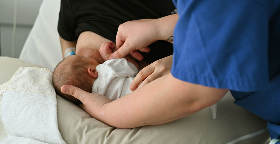 Die kleine Annabelle schmatzt und fuchtelt mit den Ärmchen in der Luft, tastet aufgeregt an der Brust der Mutter, die das knapp einen Tag alte Neugeborene auf einem Stillkissen vor sich im Arm hält. Annabelles zartes Stimmchen klingt zunehmend unzufrieden, denn das „Andocken“ an die mütterliche Brust will ihr einfach nicht gelingen. Behutsam nimmt Maren Albrecht das zierliche Köpfchen des Babys in die eine Hand und führt mit der anderen die Brust der Mutter zum Mündchen. Wie auf Knopfdruck öffnen sich Annabelles Lippen und umschließen sogleich heftig saugend die Brustwarze.