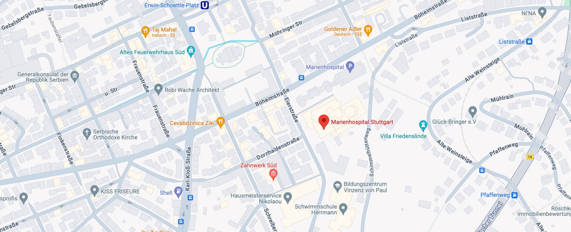 Nur ca. 350 Meter vom Marienhospital entfernt finden Sie die Haltestelle „Erwin-Schoettle-Platz (Marienhospital)“. Dort halten die Buslinie 42 sowie die Stadtbahnlinien U1 und U14.