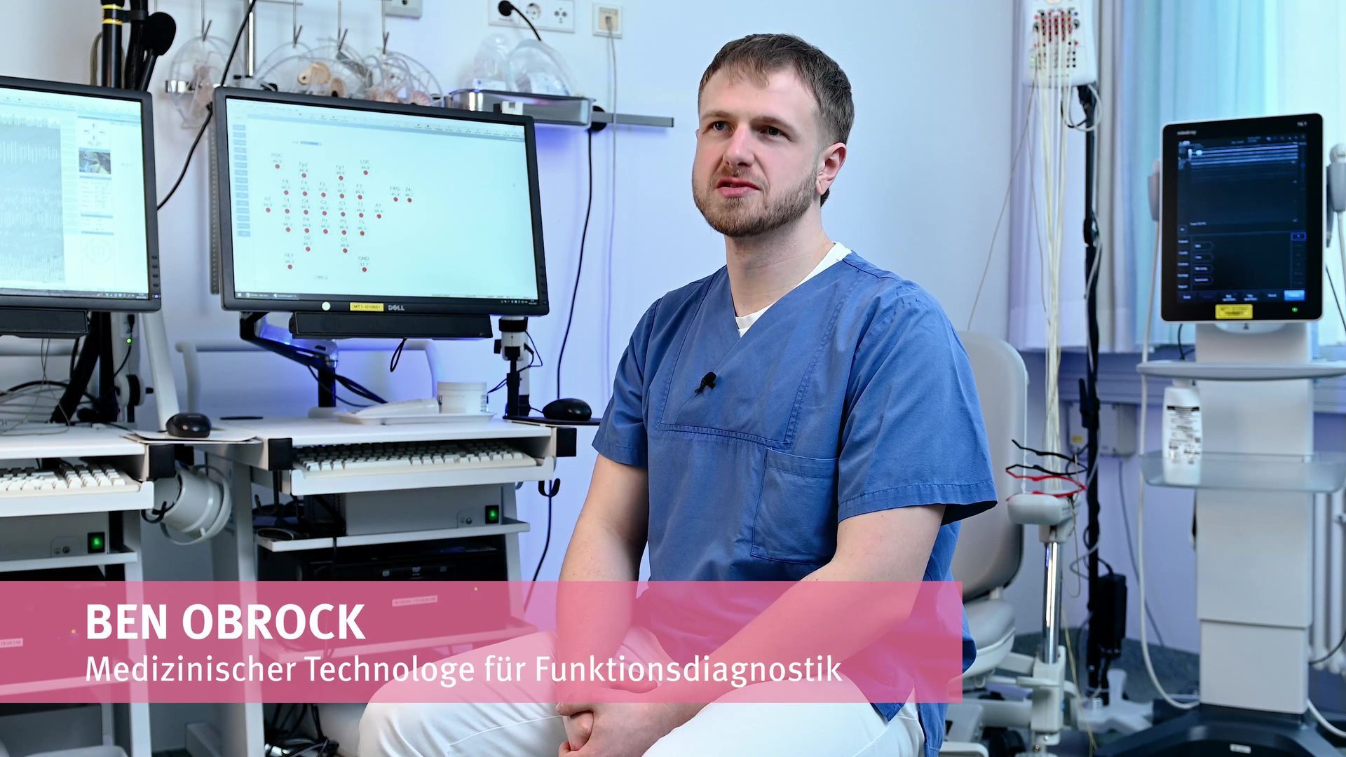 Ben ist Medizinischer Technologe für Funktionsdiagnostik – ein spannender Beruf für echte Spezialisten! Seine Ausbildung machte er hier am Marienhospital und ist nach dem Abschluss 2024 geblieben. Mittlerweile bildet er sich zum Praxisanleiter weiter. Sein Ziel: zukünftige Azubis genauso gut zu begleiten wie er es selbst erlebt hat.